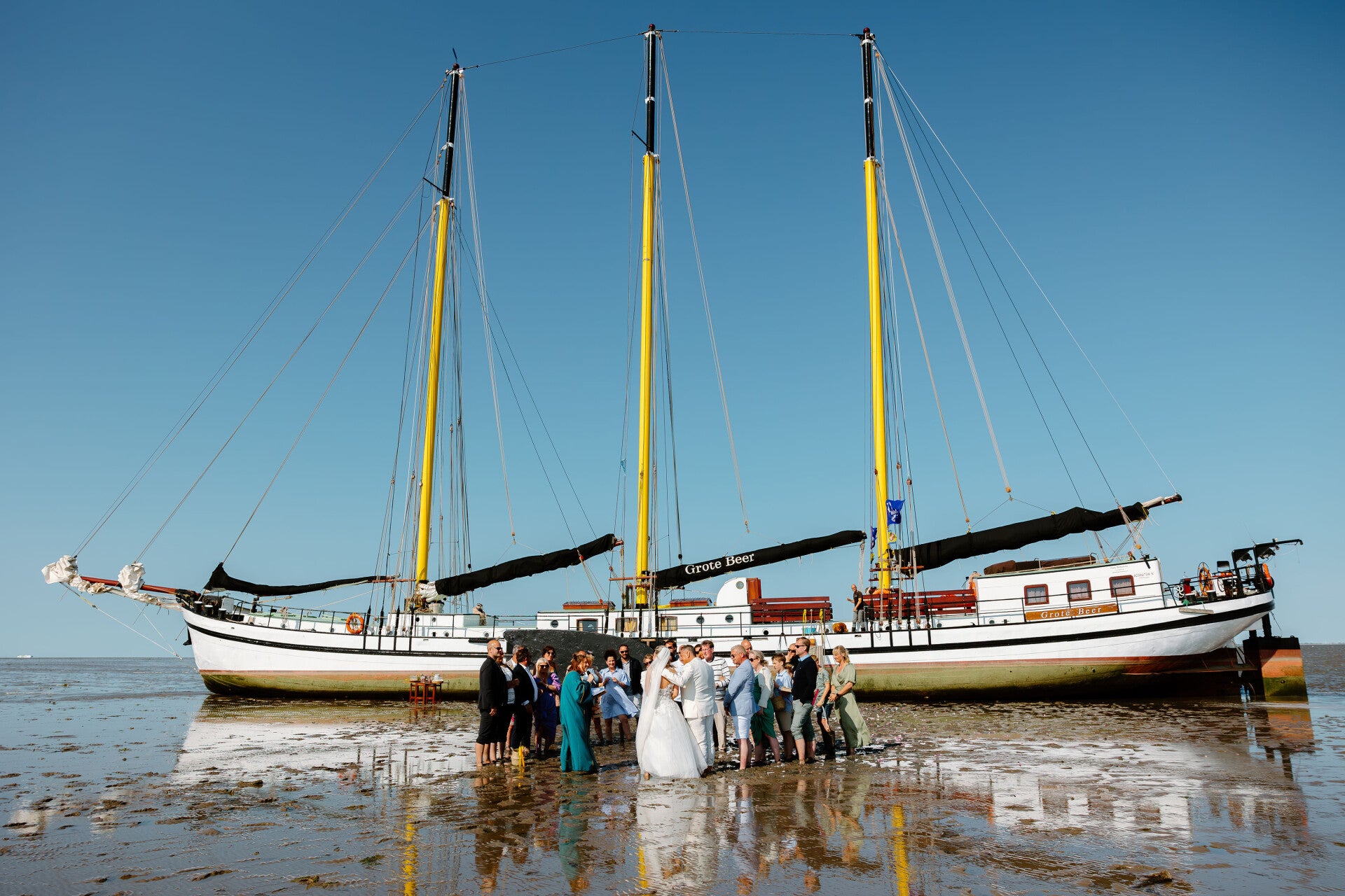 De zon streelt de topjes van grote zeilschepen in de binnenhaven van Harlingen. Een meeuw, een touw dat tegen een mast klingelt, het klotsende geluid van water dat tussen wal en schip beweegt. Eén voor één rolkoffertjes over het dek. Een lichtblauwe trouwjurk, een zandwit overhemd. Ze hangen afwachtend aan de gestreken zeilen boven een schaal fruit, koekjes en een vaas verse bloemen die klaar staan voor wat komen gaat. We gaan zo naar de zandbank om droog te vallen op het wad. Op de motor want de laatste bruiloftsgasten zijn op de valreep aan boord. De schipper spreekt nog vlug een woord van welkom en we zijn weg om twee dagen te deinen. In de roef maak ik kennis met goedlachse hofmeester Bas, die per ongeluk een kilo Hollandse garnalen ontving in plaats van 30 oesters en matroos Lynn uit Canada. Met hun zou ik (naast het huwelijk sluiten) in de overgebleven uurtjes samenwerken als invalmatroos, voor de lol. Rustig glijden we door het zacht golvende water als er plotseling een schok door het schip gaat. Als bij een aardbeving liggen we plotseling stil. Verwonderd bekijk ik vanaf het dek hoe de opvolgende uren het water geleidelijk wegtrekt rondom het jacht. Er wordt een loopplank uitgegooid en even later staat er een tafeltje met champagneglazen in the middle of nowhere. Omgeven door enkel eindeloos nat zand met hier en daar een schelpje helpt hij haar op blote voeten van boord.